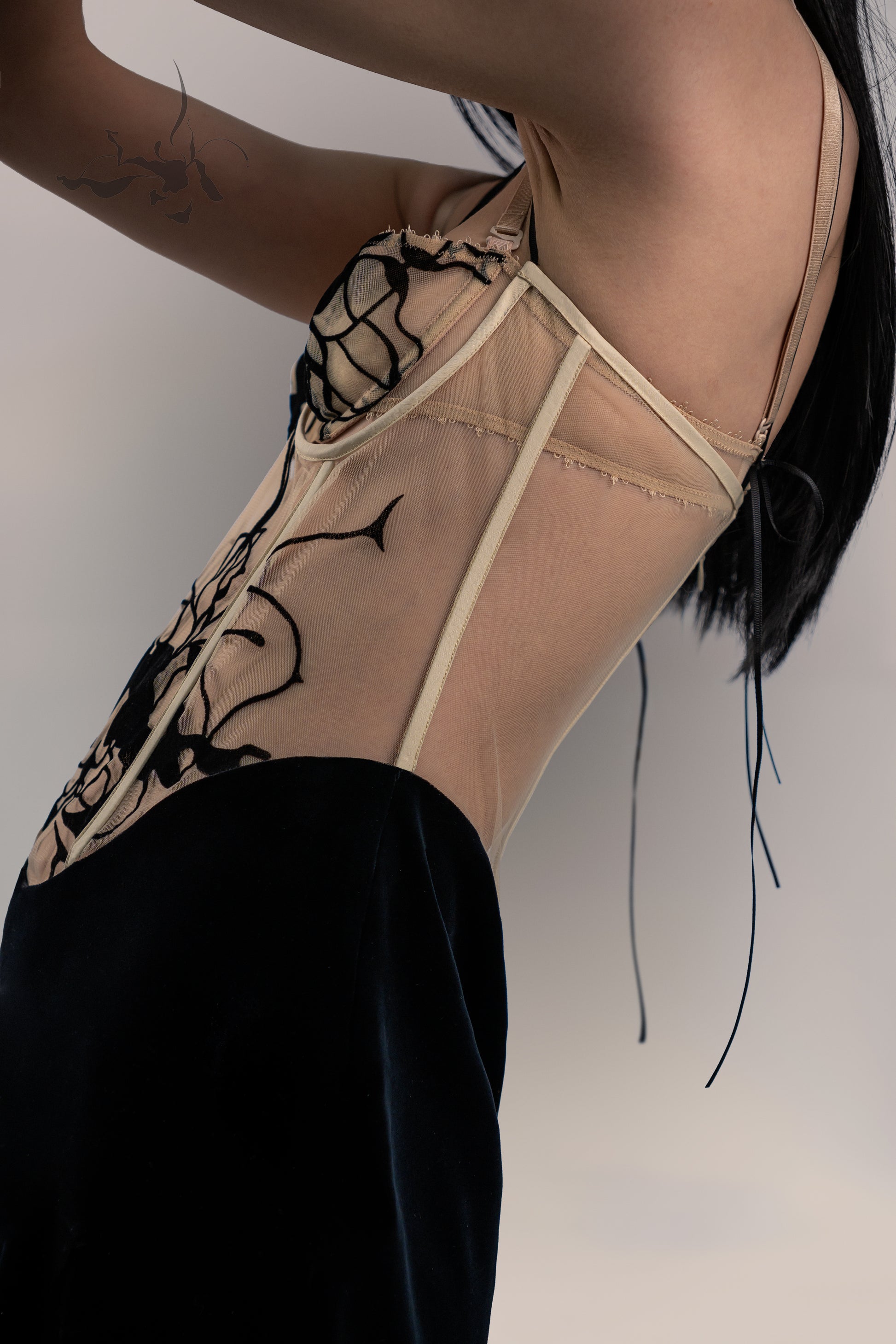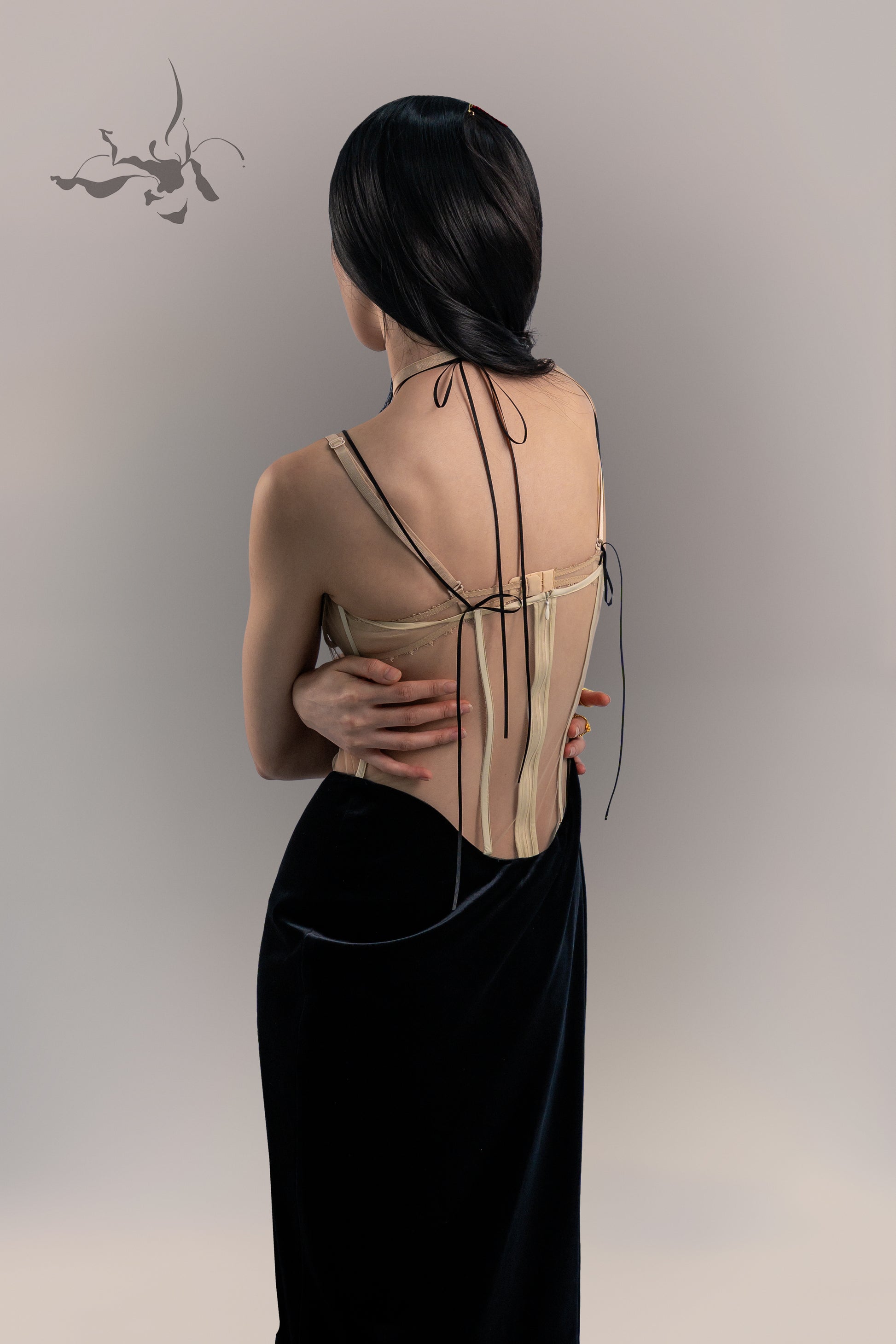 This piece is part of a collection is inspired by traditional Chinese floral totem art. It combins elegance and sensuality to highlight feminine grace while maintaining sophistication. An back zipper provides ease of wear, while PVC boning enhances waist support.