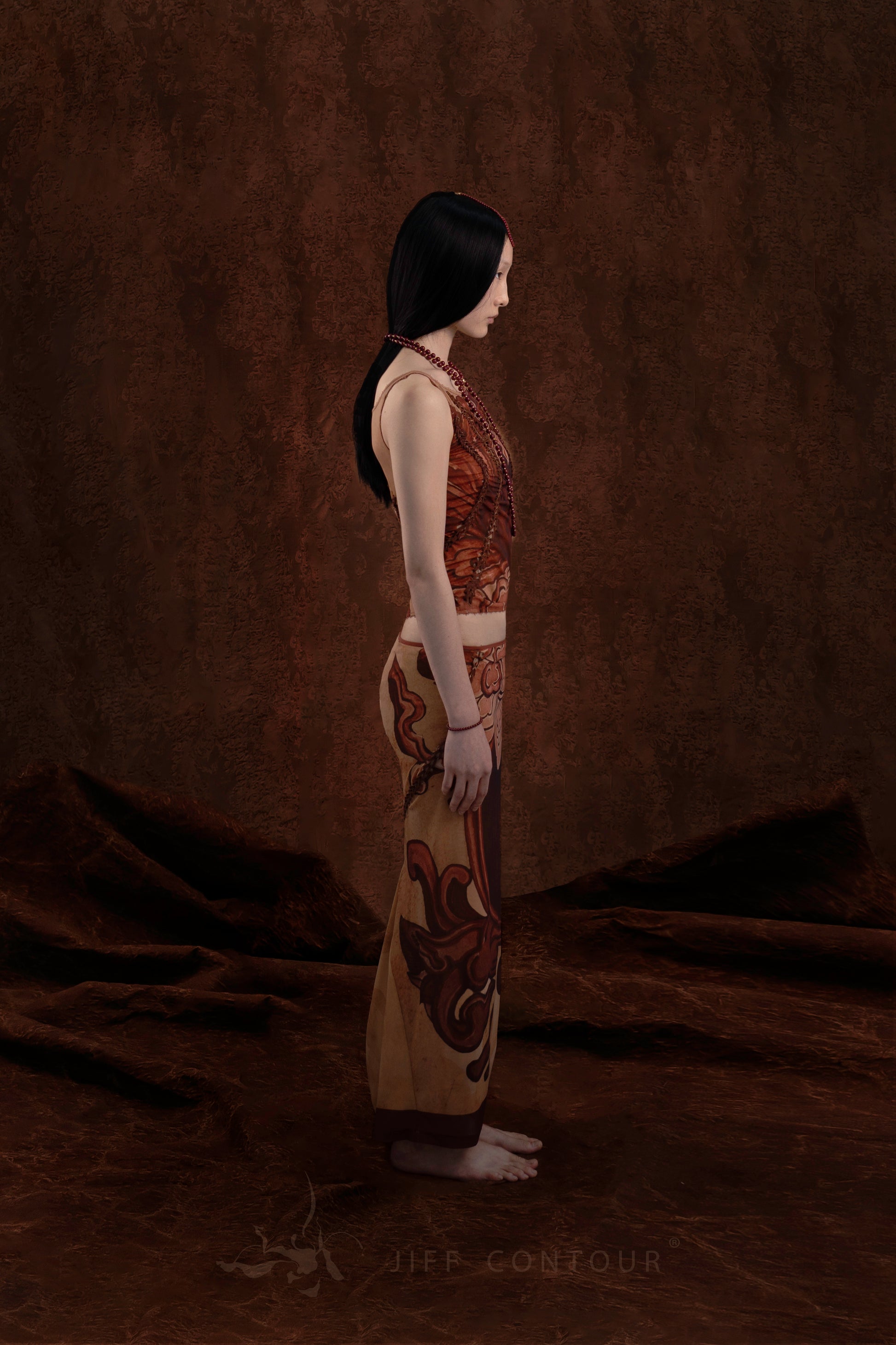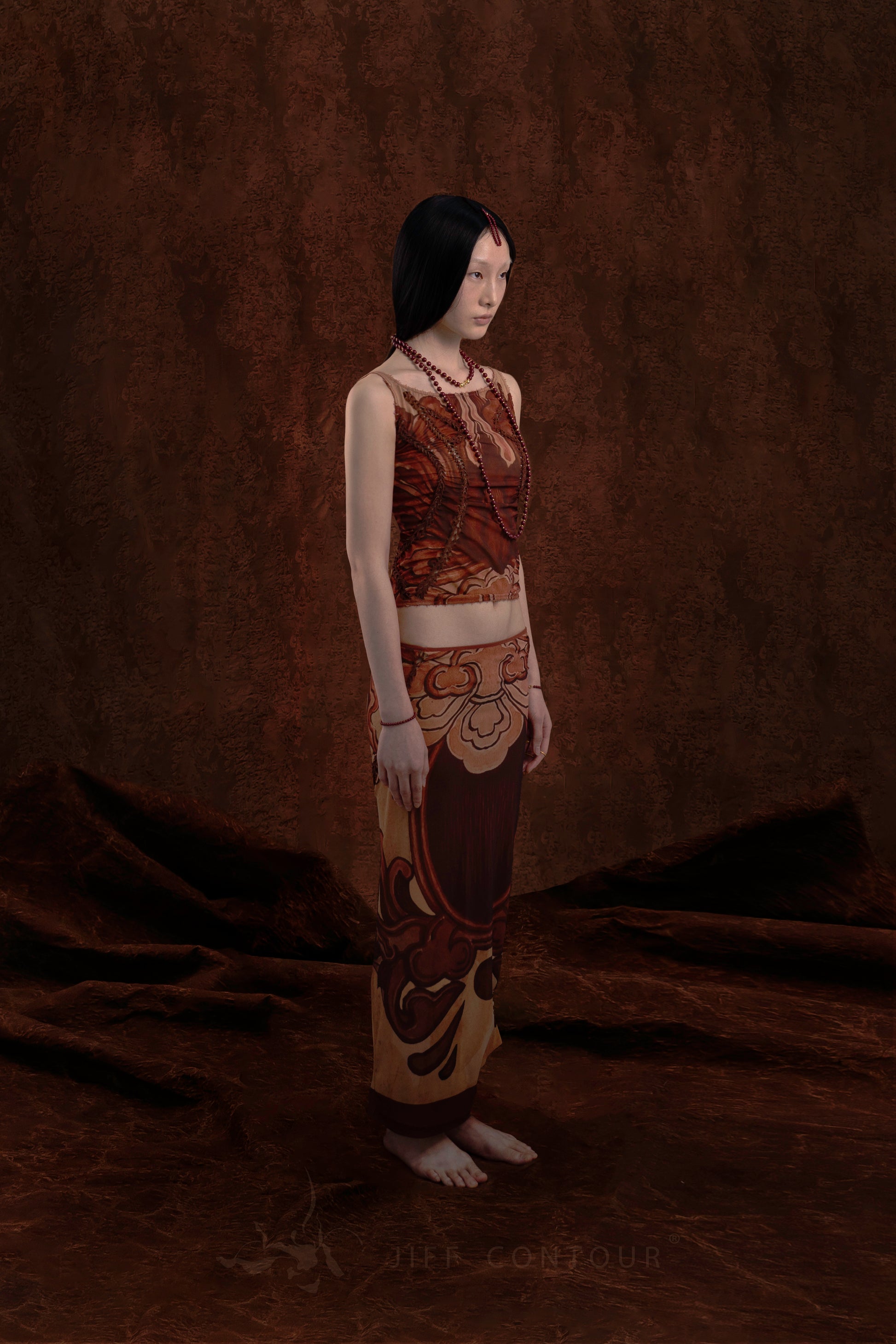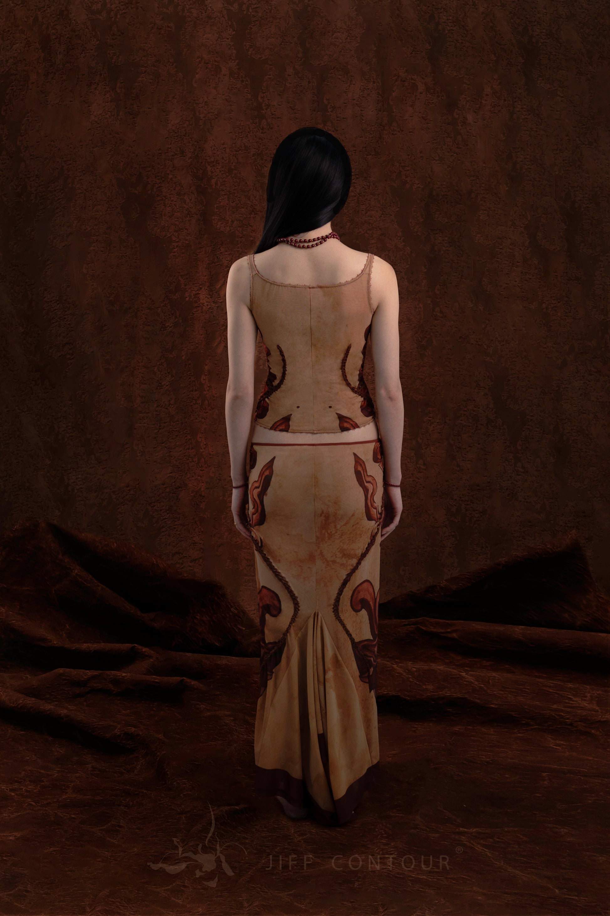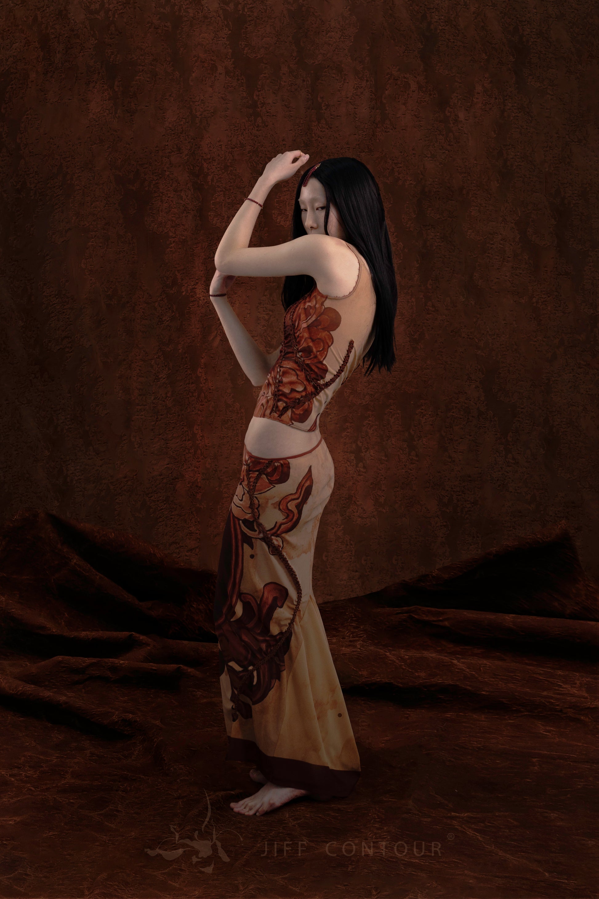 This piece is part of a collection is inspired by traditional Chinese totem art. It combines original hand-drawn pattern prints with handknitted craftsmanship, using precision printing technology to embellish your body with the totem patterns.