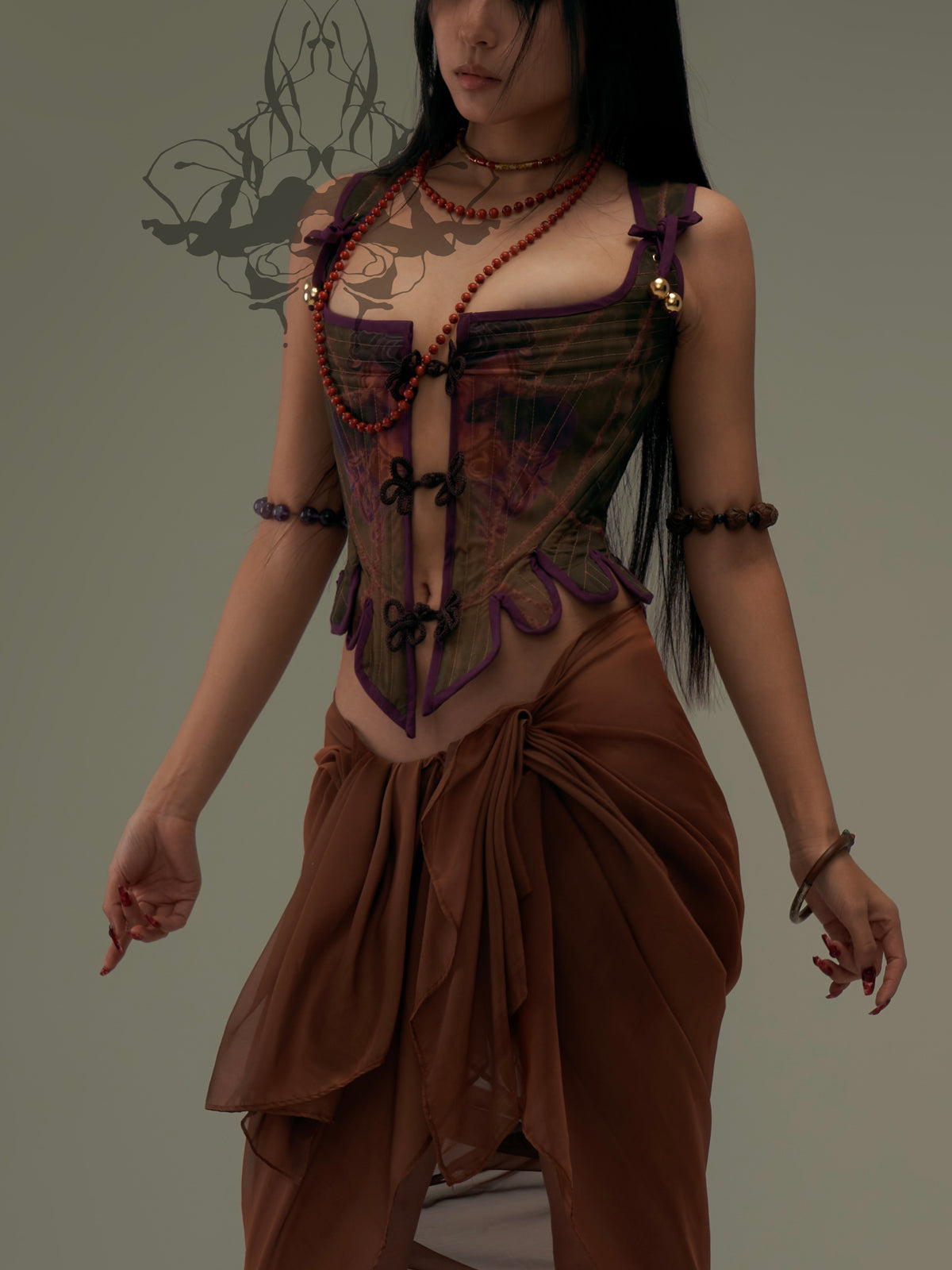 This piece combines 3D positioning printing technology with intricate hand-drawn classical patterns, resulting in exquisite and delicate detailing. To ensure the corset can be worn from both sides, a pure hand-stitch- and edge-binding technique is used. Each side offers a different look, effectively providing the versatility of two beautiful corsets in one. The front panel showcases handcrafted oriental buttons, blending beauty with ease of wear, while the back features adjustable lacing for a perfect fit.