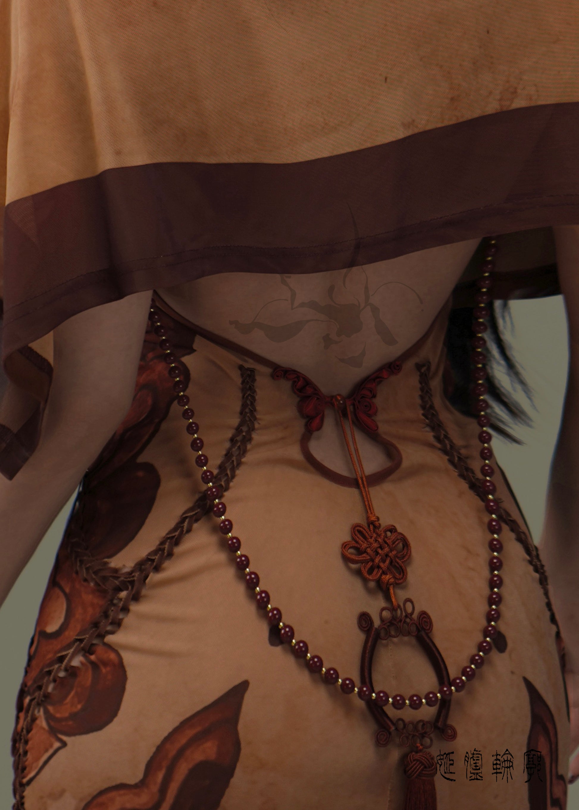 The back is decorated with traditional oriental button loops and a hanging tassel that sways gracefully with the wearer's movements.This garment uses high-quality stretch-eyelet fabric for long-lasting durability and breathability.
